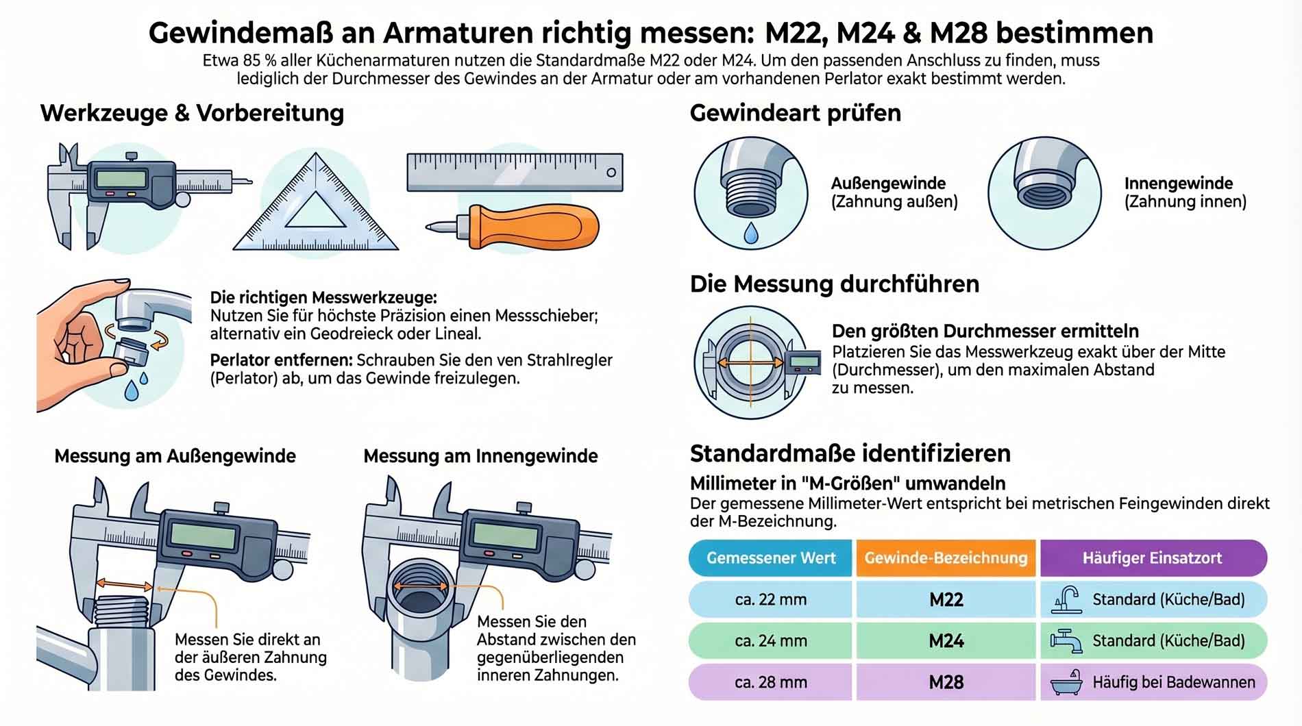 Dusch-Anschlüsse sind weltweit auf 1/2-Zoll genormt, doch Wasserhähne haben unterschiedliche Gewindemaße. Während in Deutschland das M22-Außengewinde oder das M24-Innengewinde bei Standard-Armaturen weit verbreitet sind, nutzen moderne Design-Armaturen oft kleinere oder versteckte Gewinde (Caché-Perlatoren). Ein Legionellenfilter benötigt jedoch einen festen, dichten Sitz, um die Membranen vor Verunreinigungen zu schützen und den Druck auszuhalten.