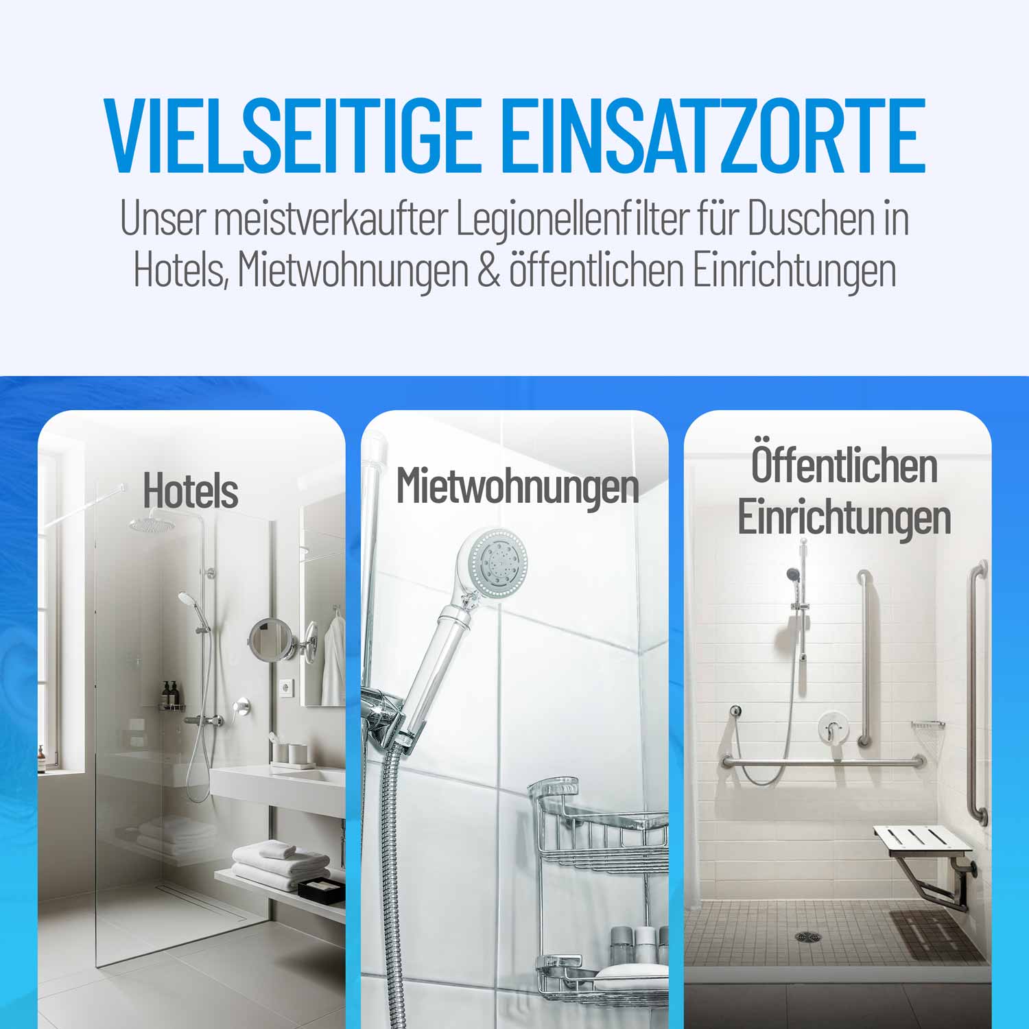 Legionellenfilter hält sicher die Legionellen zurück. Von unabhängigen Laboren bestätigt. Der Duschkopf und der Legionellenfilter entsprechen der TWIN 12-Empfehlung.