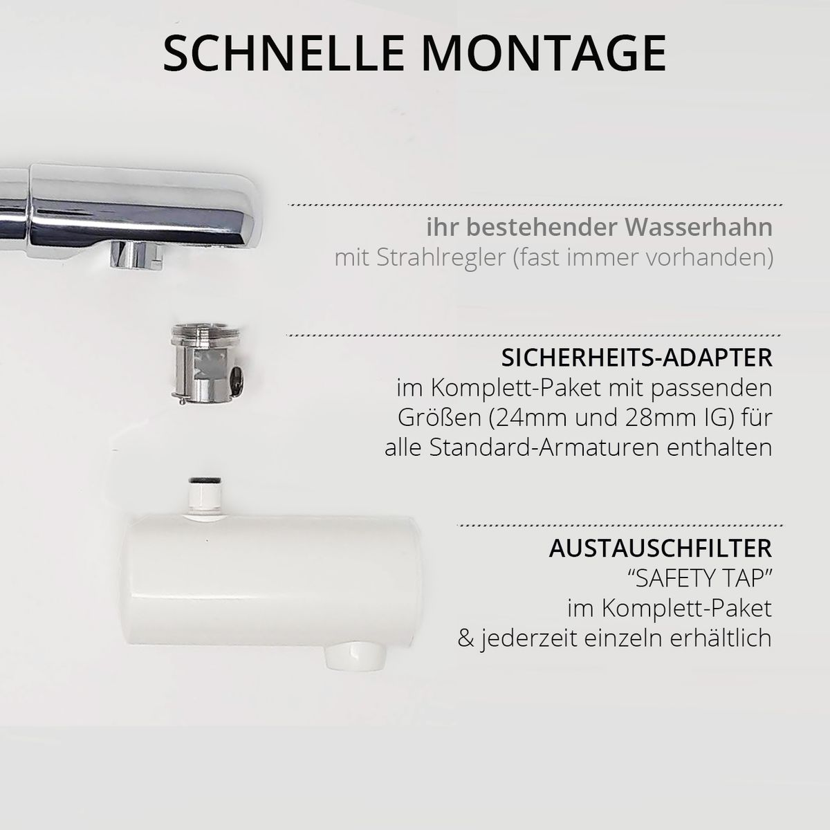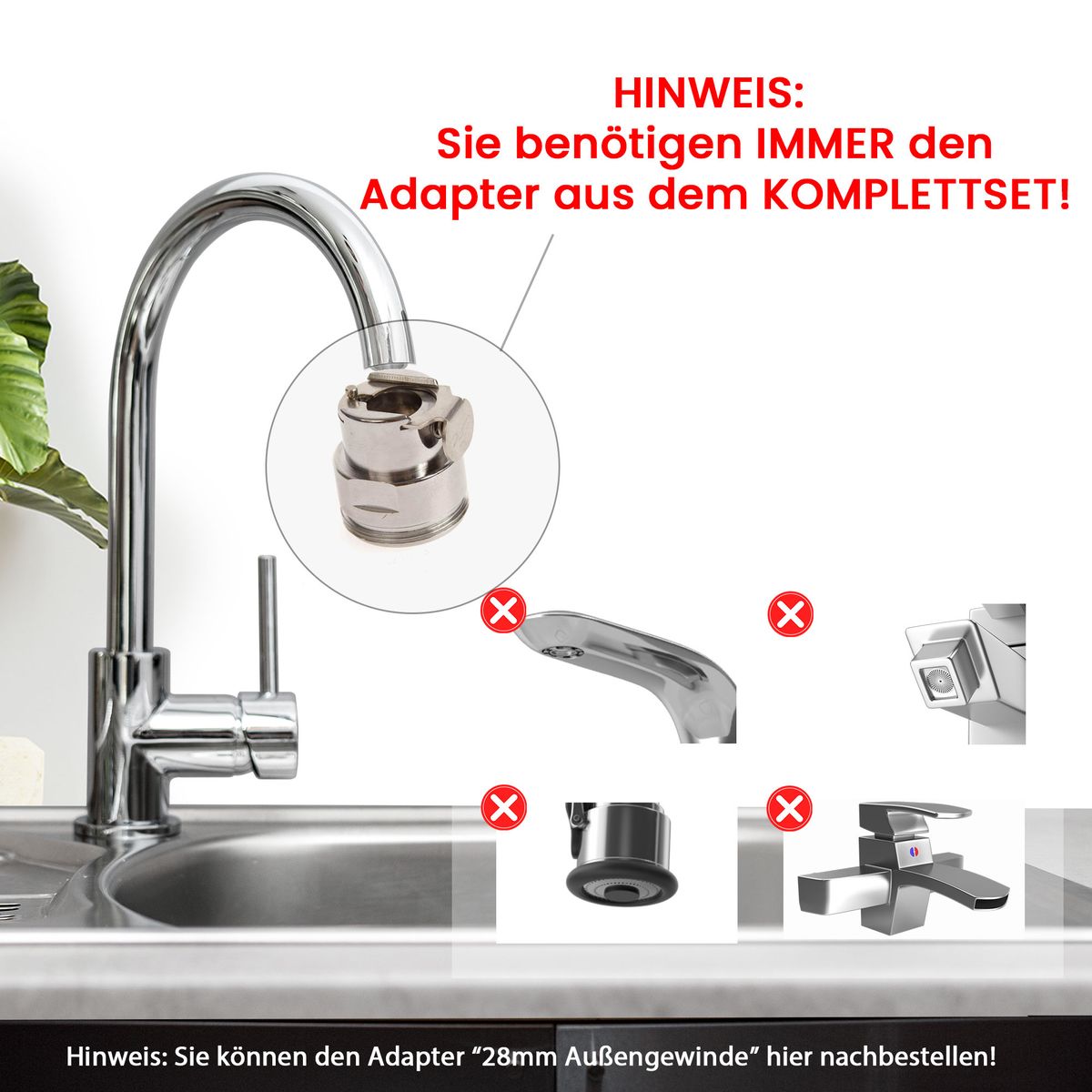 ACHTUNG: Zur Installation am Wasserhahn benötigen Sie einen Adapter, der im Komplettset als Multi-Adapter erhalten ist (Standard-Anschlüsse 24mm bzw. 28mm Außengewinde). Andere Formate können wir Ihnen kurzfristig beschaffen.