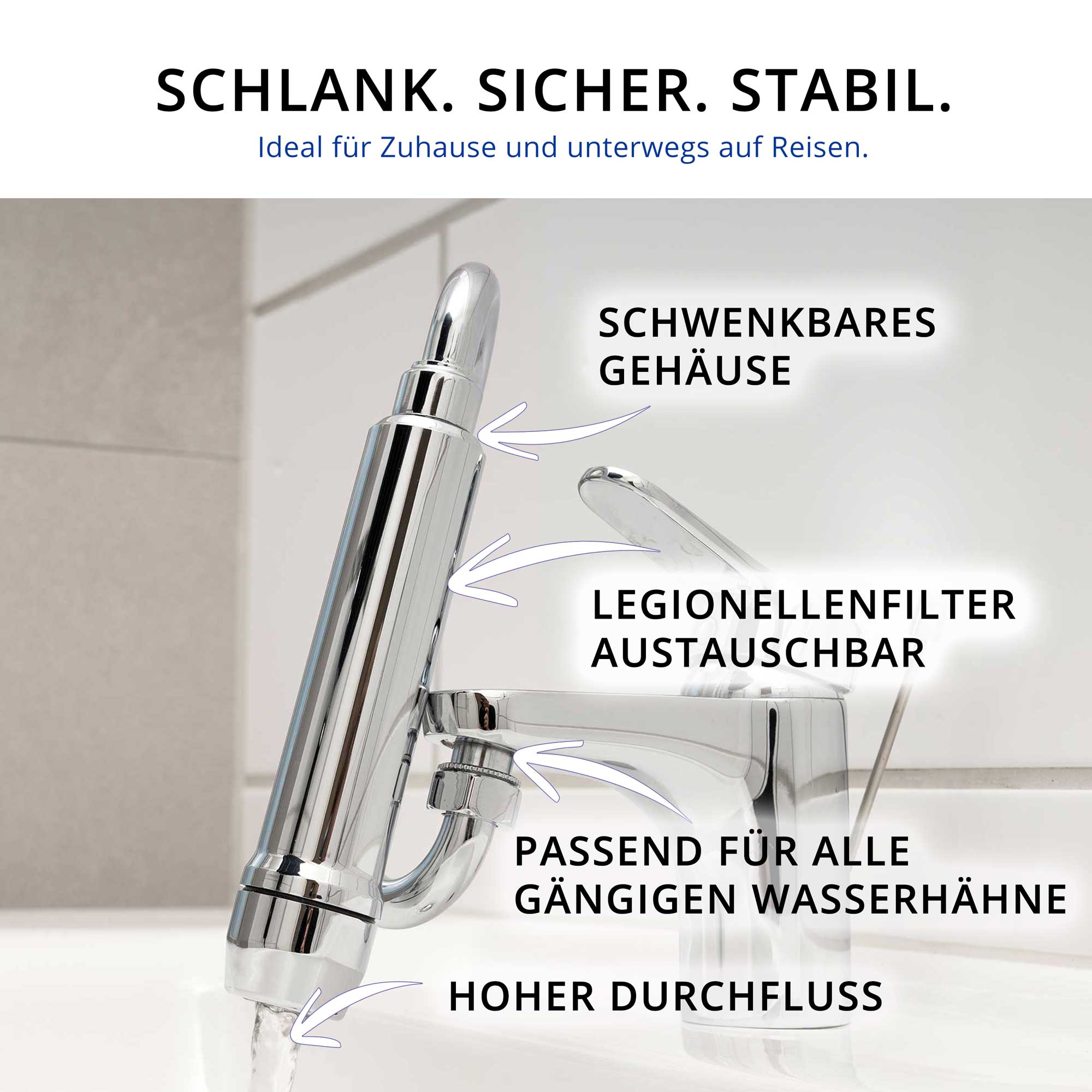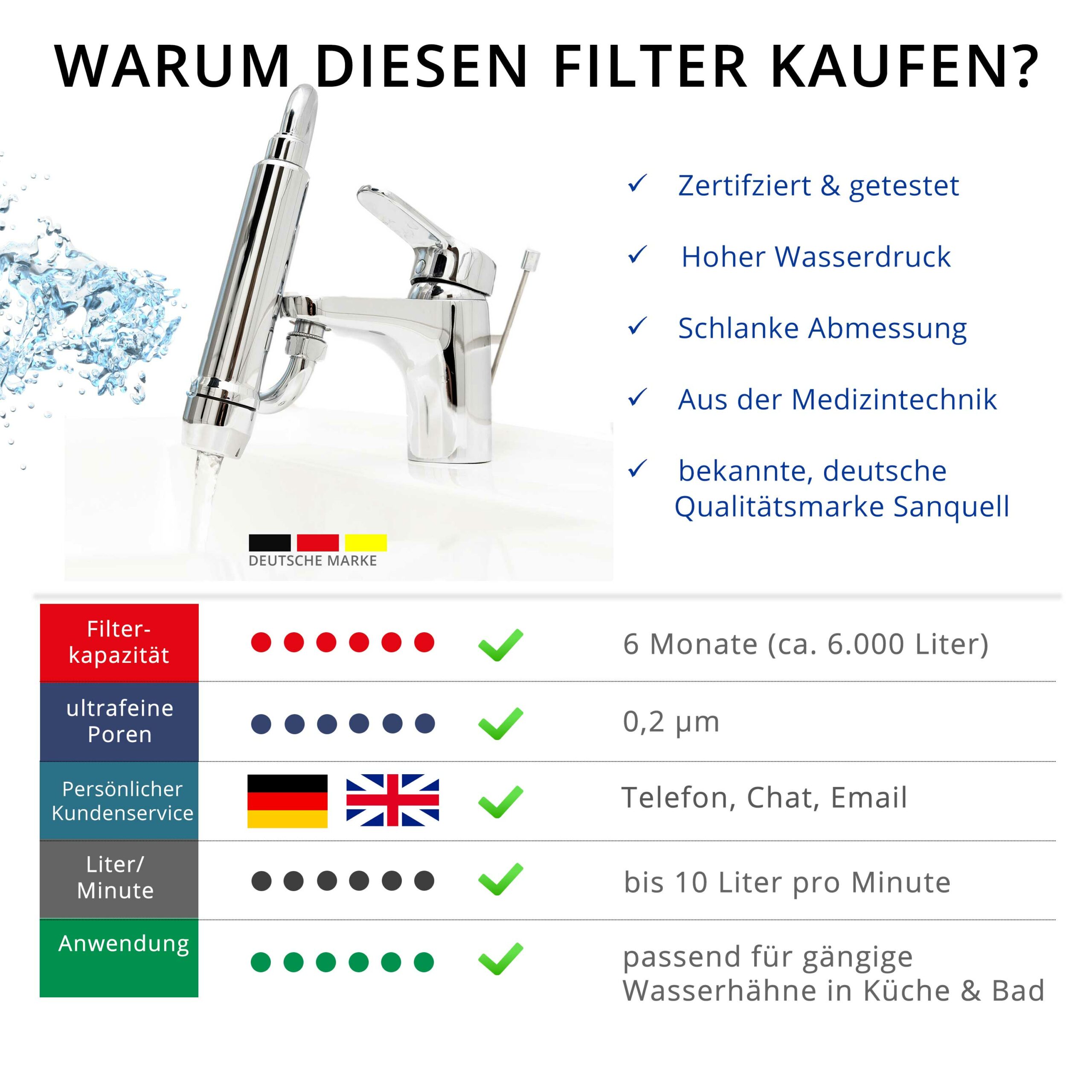 - RÜCKHALT: 99,999999% (log8) aller Legionellen, e.Coli und Pseudomonas