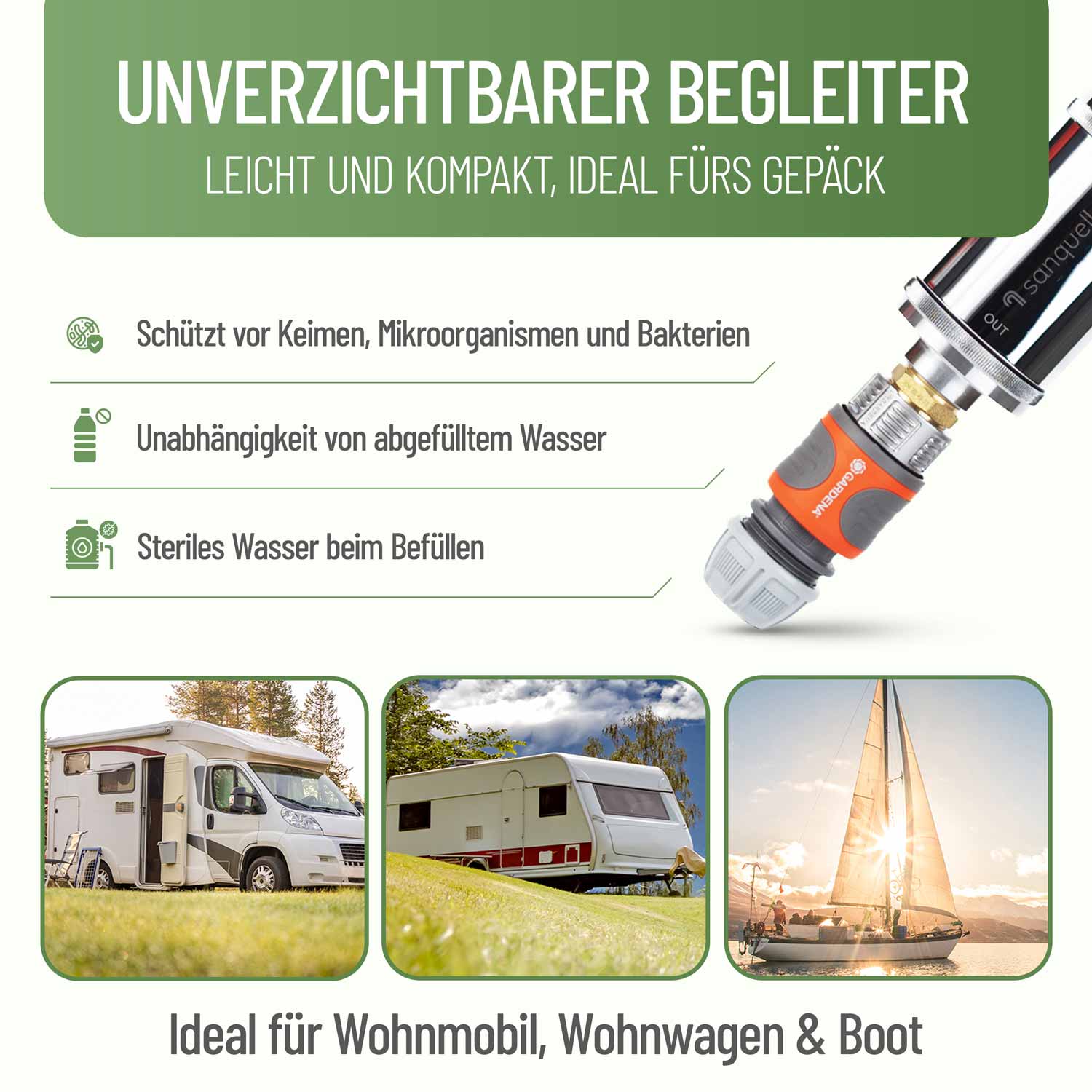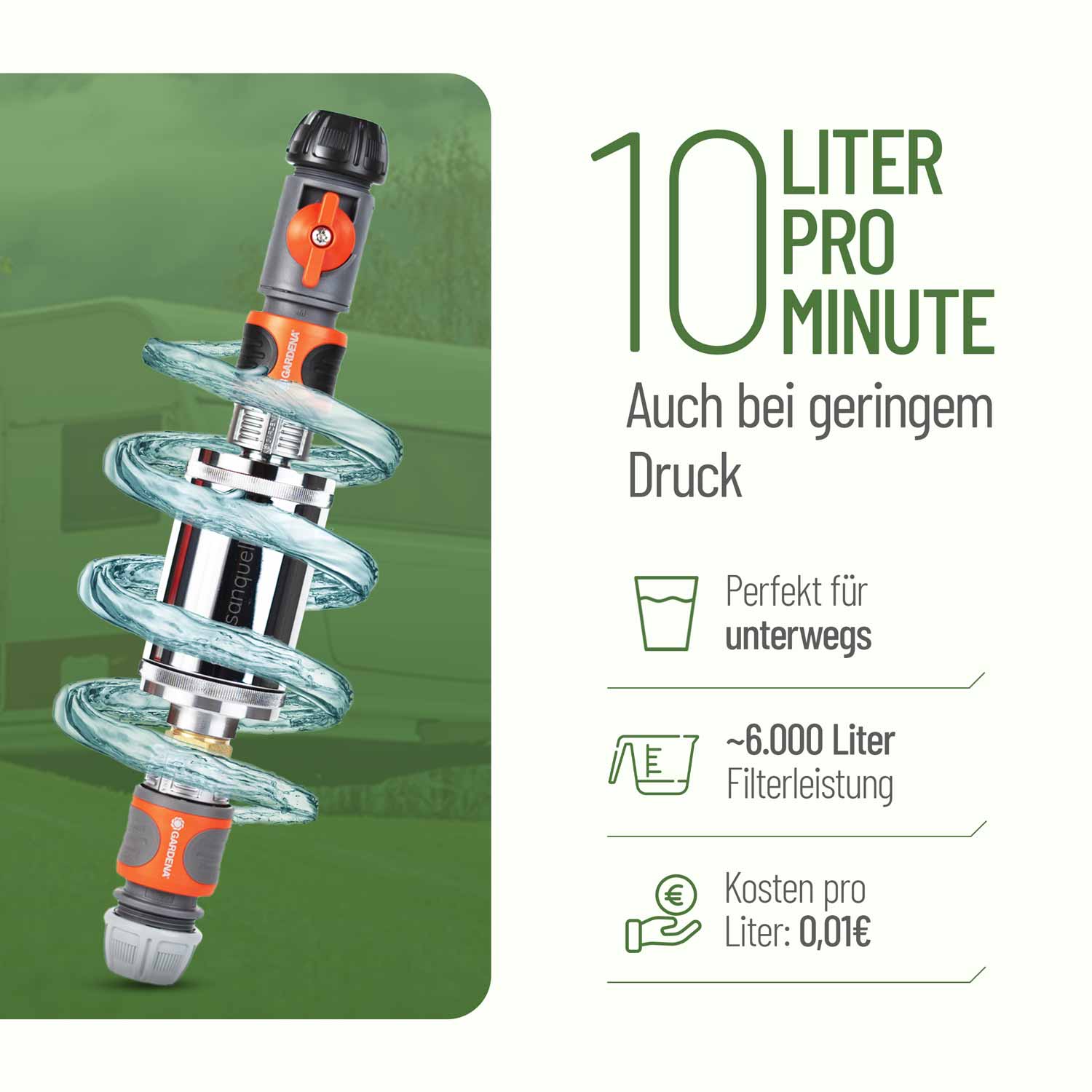 Wir nutzen den Camping-Wasserfilter seit einigen Wochen für unser Wohnmobil. Die Filterleistung ist wirklich gut, hoher Wasserdruck und das Wasser schmeckt deutlich besser als vorher. Ein Nachteil ist, dass der Filter relativ schwer ist. Bei Tankdeckeln ohne Gardena-Anschluss muss man entweder den Filter während der Befüllung festhalten oder man verlängert den Schlauch. Insgesamt überzeugt uns aber der Wasserfilter.