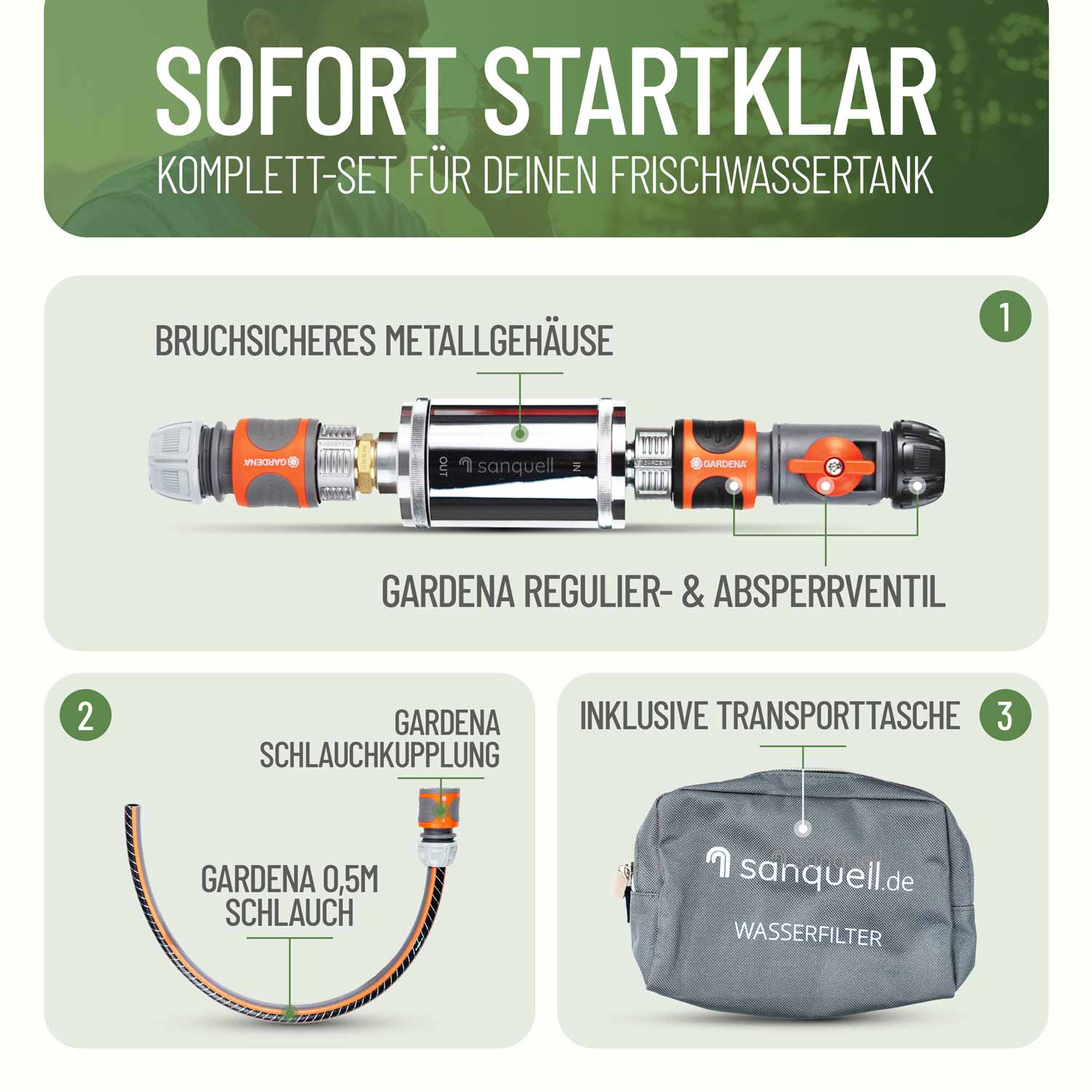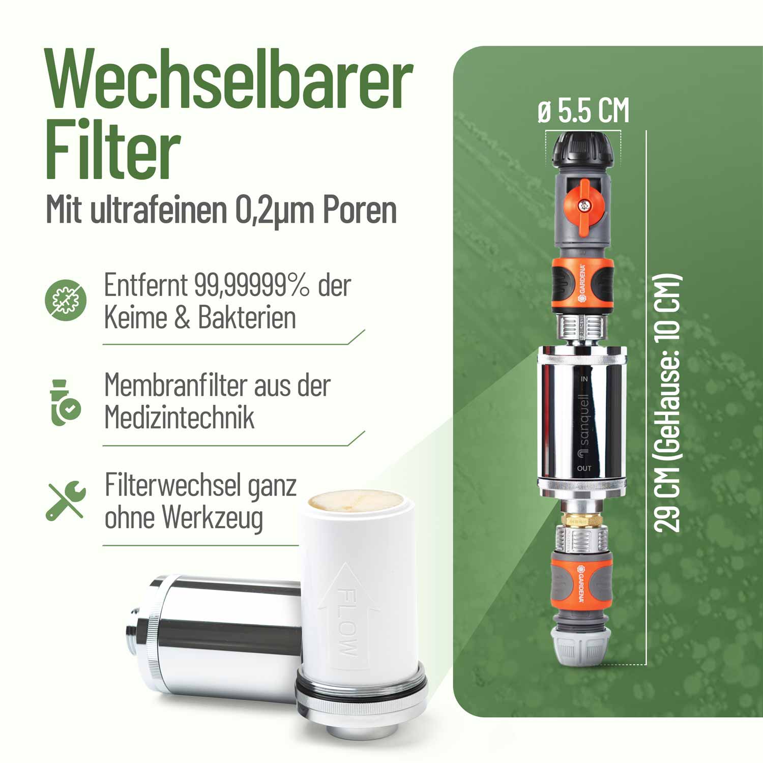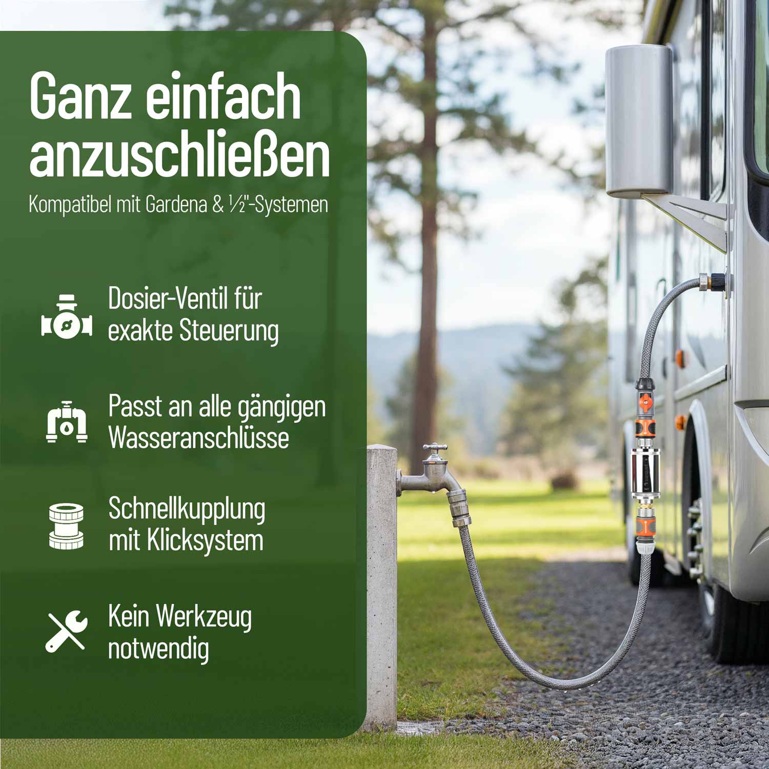 Absperrhahn am Befüllfilter ermöglicht eine präzise Einstellung der Wassermenge. Anschlüsse kompatibel zu gängigen Gardena-Anschlüssen sowie 1/2"-Zoll-Anschlüssen.