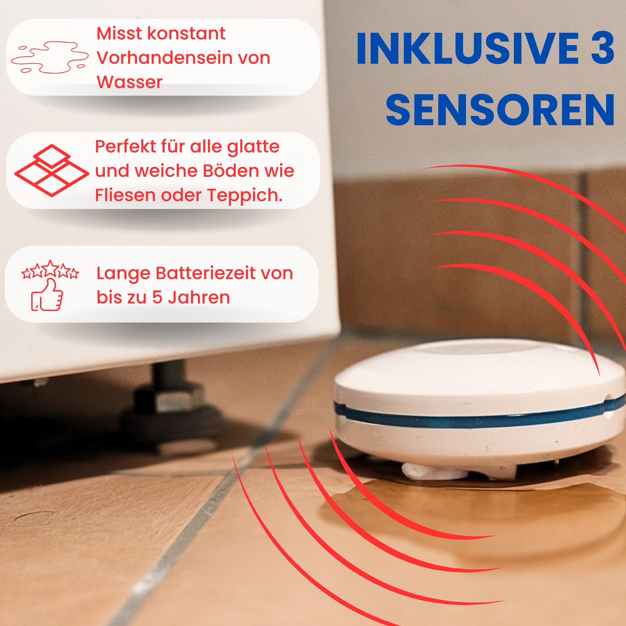 Das Offline-Leckageschutzsystem erkennt durch mehrere im Haus verteilte Wassersensoren austretendes Wasser und schaltet im Falle eines Lecks die Hauptwasserleitung ab. Es wird keine App, kein Internet oder kein WLAN benötigt.