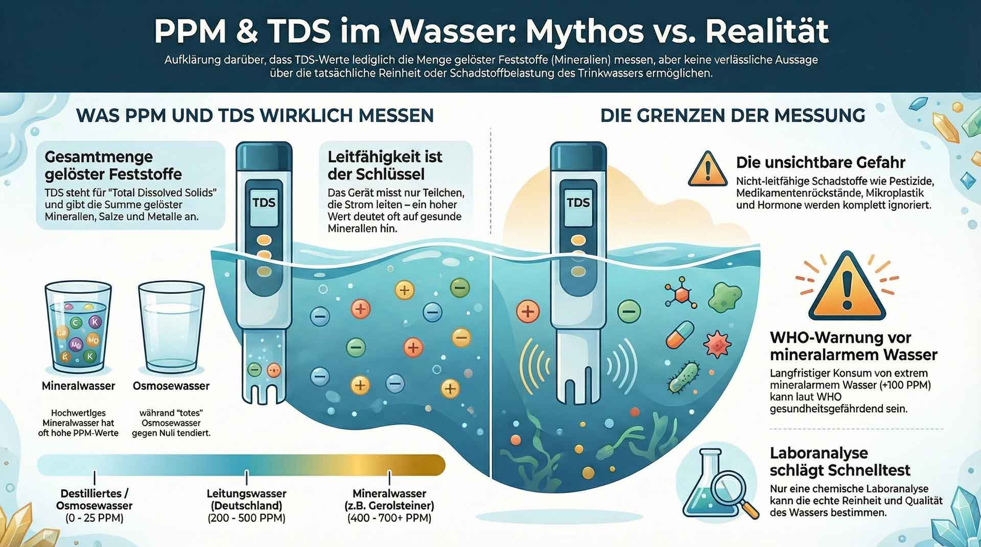 Das zeigt, dass der TDS-Wert allein keine eindeutige Aussage über die Qualität eines Wassers erlaubt.