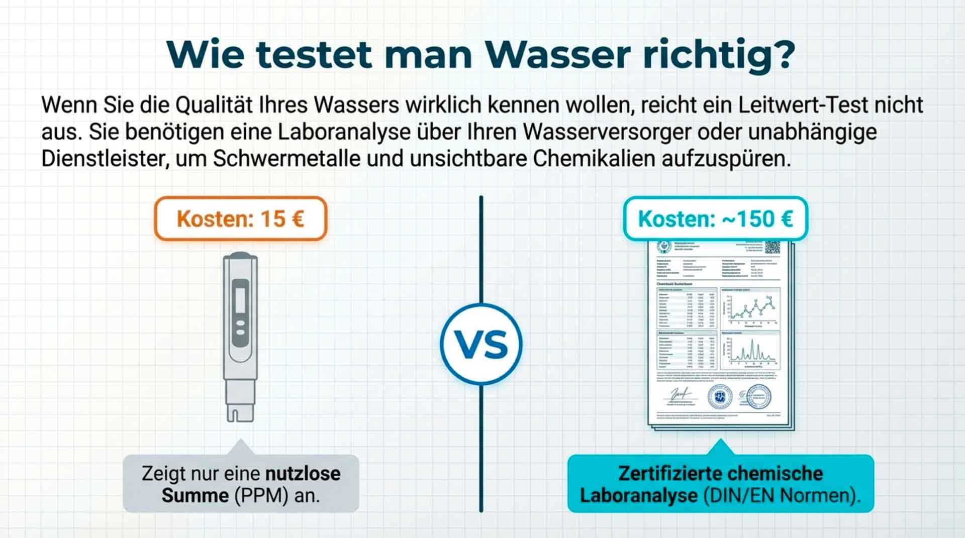 Diese Werte dienen lediglich als Orientierung. Darüber hinaus bewertet die deutsche Trinkwasserverordnung die Sicherheit von Trinkwasser nicht nur anhand der Leitfähigkeit oder der Total Dissolved Solids, sondern anhand zahlreicher weiterer Parameter. Dazu gehören unter anderem Grenzwerte für Schadstoffe, bestimmte Chemikalien, Metalle wie Blei sowie mikrobiologische Kriterien.